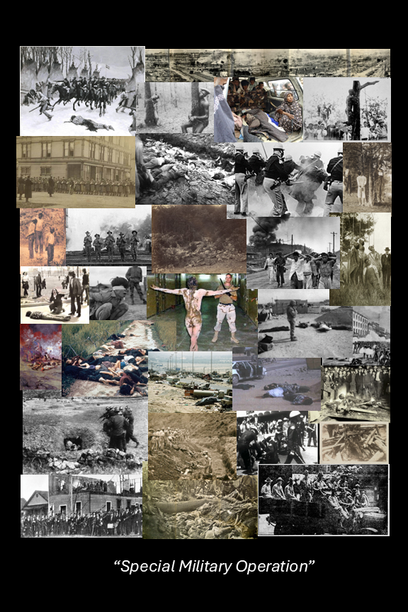 The title "Special Military Operation" appears to be a reference to euphemistic language used to describe military actions while minimizing their true nature. The collage presents stark visual evidence of the brutal realities of warfare, genocide, and military violence across different conflicts.