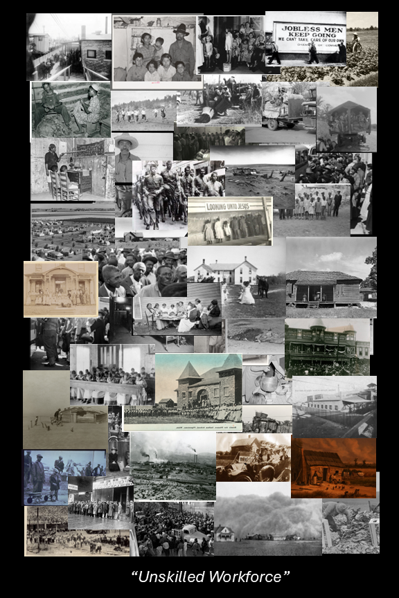 The collage captures the experience of manual laborers, seasonal workers, and the unemployed during what appears to be the Great Depression era. The arrangement suggests themes of economic hardship, the search for work, and the struggles of those dependent on physical labor for survival. The title "Unskilled Workforce" reflects the classification and challenges faced by workers without specialized training during periods of economic uncertainty.