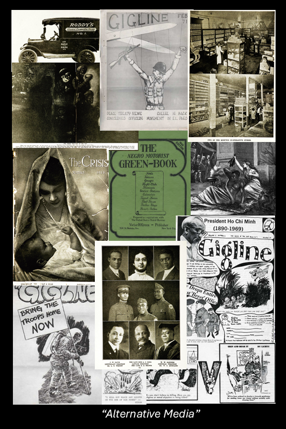 This is a black and white collage titled "Alternative Media" featuring various historical publications, newspapers, and media materials that appear to represent counterculture, radical, or independent press from different eras.