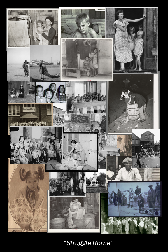 The photographs have the documentary style characteristic of Depression-era photography or social realism, capturing both individual portraits and broader social conditions. The collage arrangement creates a narrative about perseverance through difficult circumstances, with the title "Struggle Borne" reinforcing themes of endurance and survival in the face of adversity. The overlapping presentation suggests interconnected experiences of hardship across different communities and time periods.