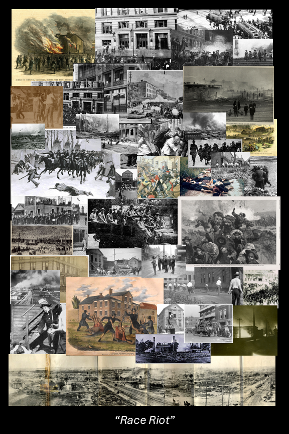 This is a historical collage titled "Race Riot" containing approximately 40-50 photographs and illustrations documenting racial violence and civil unrest in American history, primarily from the late 19th through mid-20th centuries.